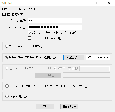 ログイン時のパスワードは生成したキーのパスフレーズを使用しよう。