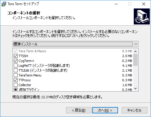 「コンポーネメント」を選択する画面だが、これもそのままで大丈夫だ。「次へ」をクリックしよう。
