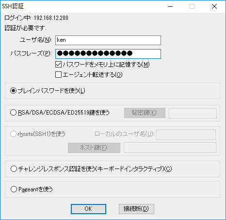 個人レベルもしくはLAN内のみの使用などの場合、通常通りにパスワード認証してもあまり問題にはならないが、それでもセキュリティ面では脆弱なので「公開キーと秘密キー」を使用して認証を行うとよい。