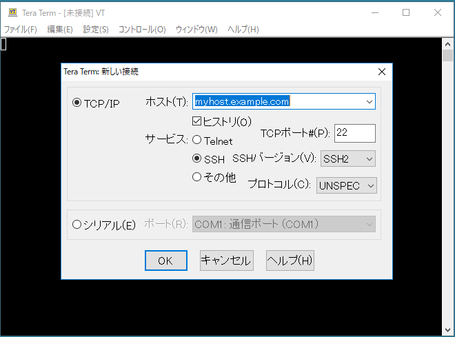 - ホスト:接続先ホストのアドレス(ドメイン名もしくはIPアドレス)