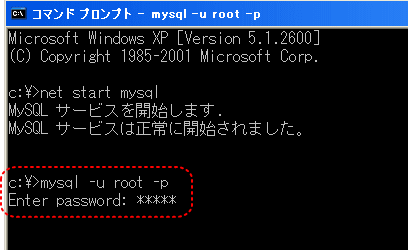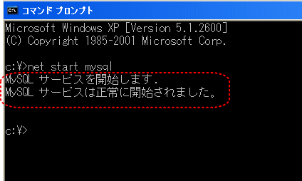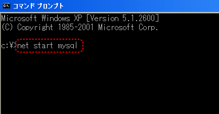 【2】MySQLを開始します。「net start mysql」と入力し、「Enterキー」を押します。