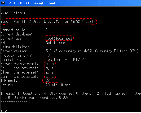 MySQLのバージョン、現在のユーザー、文字コード、ポート番号などが確認できます。