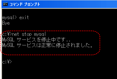 【9】MySQLを停止します。「net stop mysql」と入力し、「Enterキー」を押します。