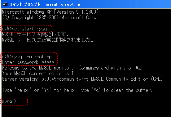 2.「net start mysql」と入力し、「Enterキー」を押します。