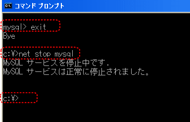 2.「net stop mysql」と入力し、「Enterキー」を押します。