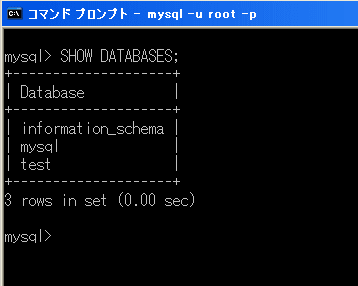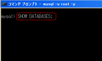 【2】「SHOW DATABASES;」と入力し、「Enterキー」を押します。