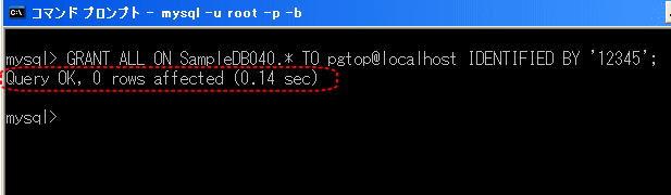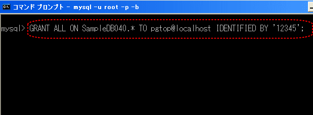 【2】「GRANT ALL ON SampleDB040.* TO pgtop@localhost IDENTIFIED BY '12345';」と入力し、「Enterキー」を押します。