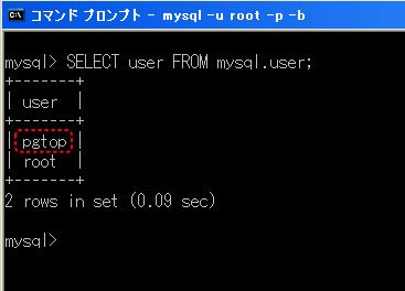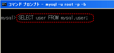 【4】「SELECT user FROM mysql.user;」と入力し、「Enterキー」を押します。