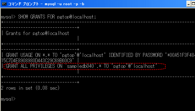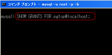 【6】「SHOW GRANTS FOR pgtop@localhost;」と入力し、「Enterキー」を押します。