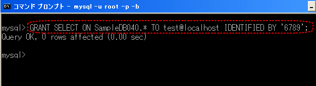 GRANT SELECT ON SampleDB040.* TO test@localhost IDENTIFIED BY '6789';