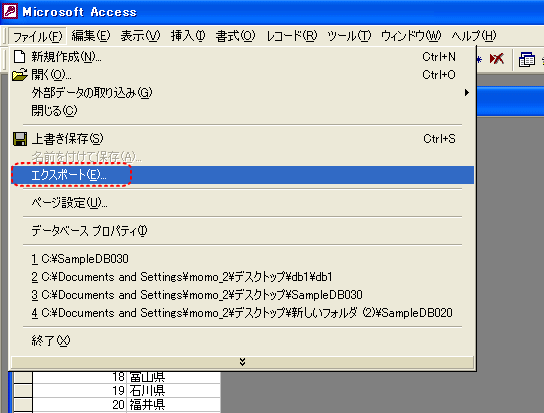 【2】Accessのテーブルを開いた状態で、メニューから ファイル → エクスポート を選択します。