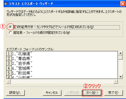 【4】「区切り記号付き」を選択し、「次へ」ボタンをクリックします。