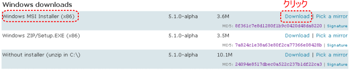 【6】Windows MSI Installer (x86) の「Download」をクリックします。