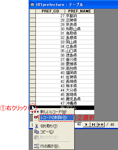 【11】次はレコードを削除します。削除したいレコードの左をマウスで右クリックし、「レコードの削除」を選択します。