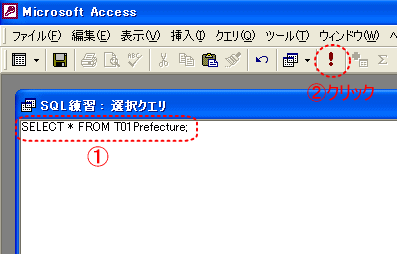 【8】以下のSQL文を入力し、「!」(実行)ボタンをクリックします。