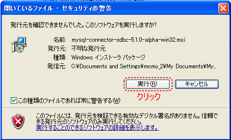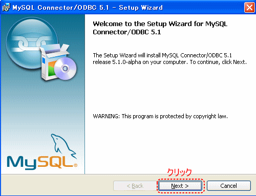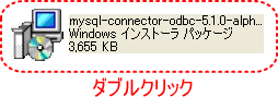【1】前回ダウンロードした「mysql-connector-odbc-5.1.0-alpha-win32.msi」をダブルクリックして実行します。(ファイル名はバージョンにより変わります)