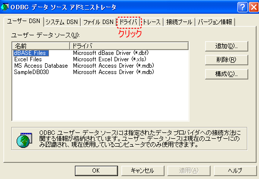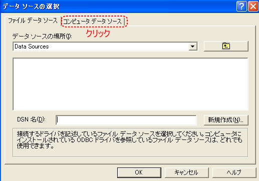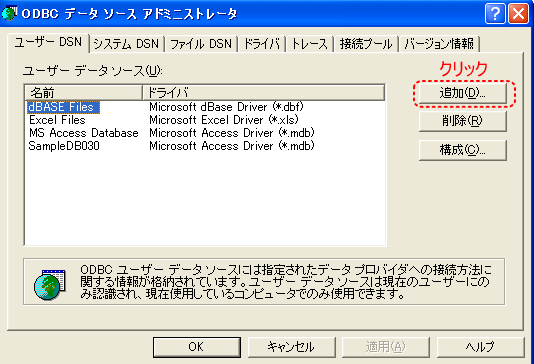 *ユーザーDNSとシステムDNSの違いは、登録したデータソースを利用できる範囲です。システムにすると、そのパソコンを使うすべてのユーザーが利用できることになります。