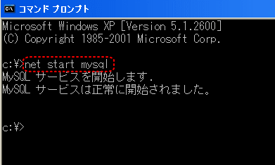 2.「net start mysql」と入力し、「Enterキー」を押します。