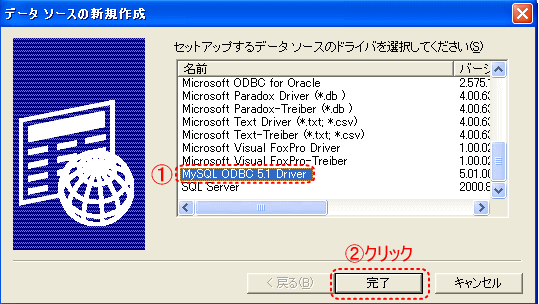 【5】ドライバに「MySQL ODBC 5.1 Driver」を選択し、「完了」ボタンをクリックします。