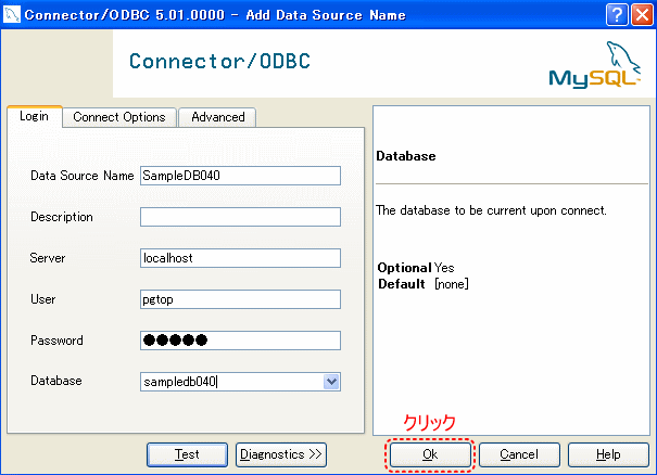 http://mysqlweb.net/article/61917190.html MySQLのデータベースをODBCデータソースに登録する方法。 Mon, 22 Oct 2007 16:14:46 +0900 今回はMySQLに作成済みの「SampleDB040」データベースを、ODBCデータソースに登録します。登録するとAccessなどのアプリケーションからMySQLに接続できるようになります。ODBCデータソースへの登録はデータベースごとになります。もしMySQLに新しいデータベースを作成してODBCを利用する場合は、新たに登録が必要です。*以下の登録作業を行なうには、MySQLが開始している必要がありますので、ご注意ください。【1】あらかじめMySQLを開始しておきます。1... mysql-297-1.gif 【2】コントロールパネルを開き、「管理ツール」をダブルクリックします。 mysql-293.gif 【3】「データソース(ODBC)」をダブルクリックします。 mysql-294.gif ここからはデータソースを追加する設定です。 【4】「ユーザーDNS」の「追加」ボタンをクリックします。 mysql-297.gif *ユーザーDNSとシステムDNSの違いは、登録したデータソースを利用できる範囲です。システムにすると、そのパソコンを使うすべてのユーザーが利用できることになります。 【5】ドライバに「MySQL ODBC 5.1 Driver」を選択し、「完了」ボタンをクリックします。 mysql-298.gif 【6】以下の図のように設定します。 Data Source Name SampleDB040 Server localhost User pgtop Password 12345 Database SampleDB040 *選択 mysql-300.gif *MySQLが開始されていないとデータベースを選択できません。 【7】設定したら「OK」ボタンをクリックします。 mysql-301.gif 【8】ユーザーデータソースに「SampleDB040」が追加されていることを確認して、「OK」ボタンをクリックします。 mysql-302.gif 【9】設定が完了したら、MySQLを停止します。 1.「net stop mysql」と入力し、「Enterキー」を押します。 mysql-340.gif 【ワンポイント】 「構成」ボタンでいつでも設定を変更できます。 mysql-303.gif ]]> MySQLに作成済みの「SampleDB040」データベースを、ODBCデータソースに登録します。登録するとAccessなどのアプリケーションからMySQLに接続できるようになります。