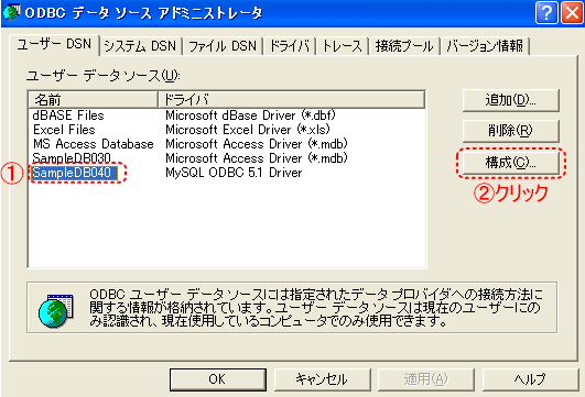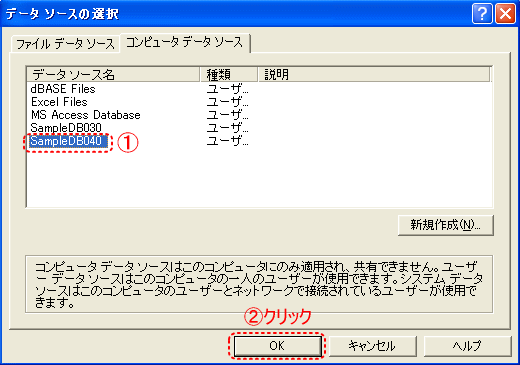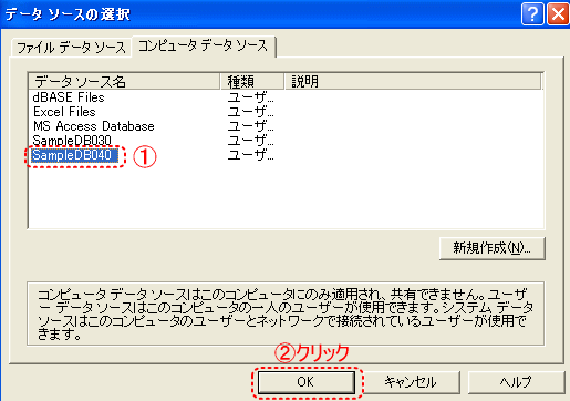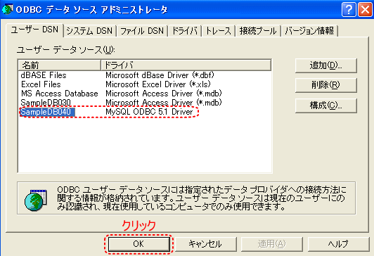 【8】ユーザーデータソースに「SampleDB040」が追加されていることを確認して、「OK」ボタンをクリックします。