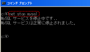 1.「net stop mysql」と入力し、「Enterキー」を押します。