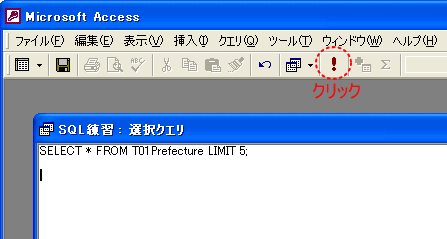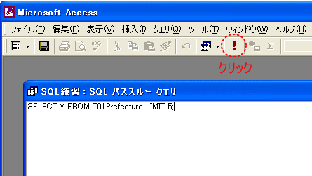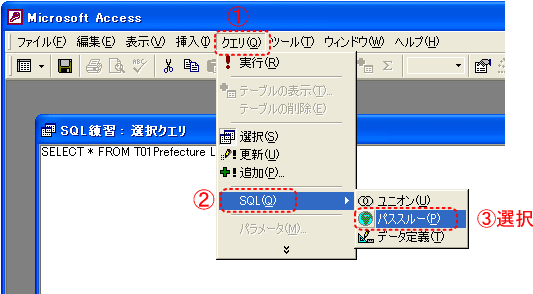 http://mysqlweb.net/article/89558110.html Accessのパススルークエリを使ってMySQLを操作する方法。 Fri, 14 Mar 2008 15:23:20 +0900 MySQL と Access では、SQL文で使える命令が全部一致しているわけではありません。もちろん基本的なSQL文は同じですが、MySQLだけで使える便利な機能もたくさんあります。そこで今回は、Access側からMySQL用のSQL文を送信できる、「パススルークエリ」について解説します。パススルークエリの使い方がわかれば、Accessの使いやすさとMySQLの高機能のいいとこどりができます。【1】以下の図を参考にMySQLを開始・接続します。1.コマンドプロンプトを起動し.. mysql-114.gif *「-b」オプションを付けて起動するとビープ音が出なくなります。 【2】以下のSQL文を入力し、使用するデータベースを選択します。 USE SampleDB040; mysql-116.gif 【3】「SampleDB040Conn.mdb」を開きます。 mysql-341.gif 【4】オブジェクトで「クエリ」をクリックします。 mysql-322.gif 【5】「SQL練習」を選択し、「デザイン」をクリックします。 mysql-342.gif 【6】「SQLビュー」を選択します。 mysql-324.gif 【7】SQLビューが表示されました。 mysql-325.gif 最初はわざと「選択クエリ」で、MySQL用のSQL文を入力してみます。 【8】以下のSQL文を入力します。 SELECT * FROM T01Prefecture LIMIT 5; mysql-390.gif *LIMIT はAccessでは使えないのでエラーになります。 【9】「!」(実行)ボタンをクリックします。 mysql-391.gif 【10】構文エラーが表示されるので、「OK」ボタンをクリックします。 mysql-392.gif 今度はパススルークエリに変えてみましょう。 【11】メニューから「クエリ → SQL → パススルー」を選択します。 mysql-393.gif 【12】パススルークエリに変わりました。 mysql-394.gif 【13】もう一度「!」(実行)ボタンをクリックします。 mysql-395.gif 【14】「データソースの選択」ダイアログボックスが表示されたら、「コンピュータデータソース」タブをクリックします。 mysql-396.gif 【15】「SampleDB040」を選択して、「OK」ボタンをクリックします。 mysql-397.gif 【16】SQL文の実行結果が表示されました。 mysql-398.gif 【17】SQLビューを閉じます。 【18】閉じる時にメッセージが表示されたら、「いいえ」ボタンをクリックしてください。 mysql-328.gif 【19】Accessのファイルを閉じます。 【20】以下の図を参考にMySQLを終了・停止します。 1.「exit」と入力し、「Enterキー」を押します。 2.「net stop mysql」と入力し、「Enterキー」を押します。 mysql-87.gif 【21】コマンドプロンプトを閉じてください。 【解説】 パススルークエリを使うと、Access側から MySQL の命令が使えることがわかりました。パススルークエリでは、SQL文を Accessで解釈せずに、直接MySQLにSQL文が送信されます。 前回説明した「選択クエリ」と「パススルークエリ」の違いを理解して、使い分けるとシステムを開発する時に便利です。 ]]> MySQL と Access では、SQL文で使える命令が全部一致しているわけではありません。もちろん基本的なSQL文は同じですが、MySQLだけで使える便利な機能もたくさんあります。