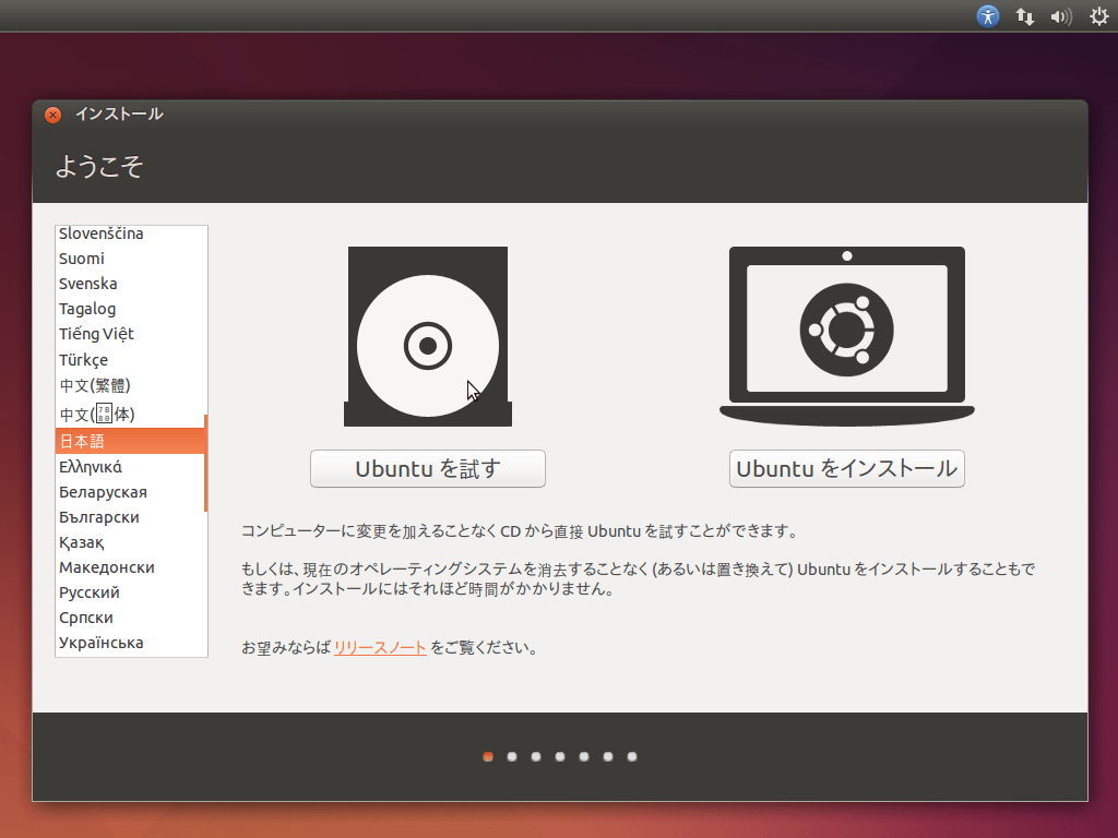 ここでは、左の言語選択にて 日本語を選択し、Ubuntu を試す をクリックします。