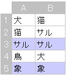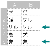 条件付き書式を使って、"A列とB列で値が同じセルに色を付ける"ことが可能です。