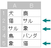 条件付き書式を使って"A列内のどこかにB列のセルと同じ値があった場合"に自動で色を付けることができます。