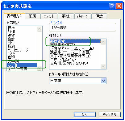 「書式」−「セル」をクリックし、「表示形式」タブの"分類"で「その他」を選択