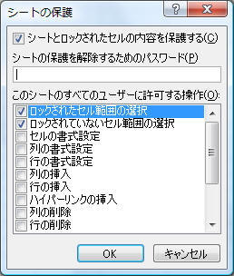 「このシートのすべてのユーザーに許可する操作」ダイアログで「ロックされたセル範囲の選択」「ロックされていないセル範囲の選択」のみにチェックが入っている状態で「OK」をクリック