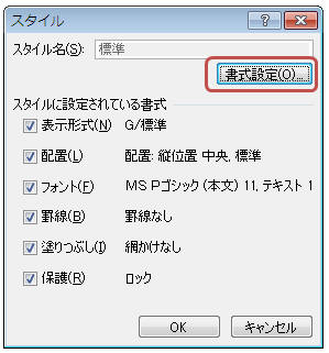 標準スタイルに設定されている書式がExcelのデフォルトの書式になります。