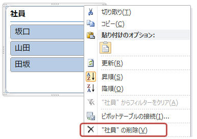 既存ピボットテーブルをクリック 「オプション」タブ−「スライサー」をクリック スライサーのフィールド(項目名)にチェックを入れる ※スライサーは「フィールド」ごとに作成されます。 ▼ スライサーが挿入されました スライサーの項目をクリック→ フィルタリングされ、データが抽出される ▼「坂口」をクリックすると「坂口」のデータのみが抽出されます