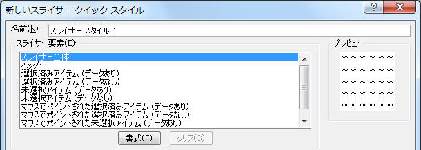 スライサーにはいくつかのスタイルが用意されています。独自の書式でスタイルを作成することも可能です。 ◆ スタイルを適用する ◆ スライサーをクリックし「オプション」タブをクリック 「スライサースタイル」から任意のスタイルをクリック ◆ 独自の書式でスタイルを作成する ◆ スライサーをクリックし「オプション」タブをクリック 「スライサースタイル」の右下にある「▼」ボタンをクリックし「新しいスライサースタイル」をクリック (又は既存のスライサースタイルを右クリックし「複製」とすると既存スタイルを基に書式を設定できます。) 「書式」をクリックして「塗りつぶし色」「フォント」「罫線」を指定する 書式の適用はスライサーの各要素に対して設定できます。 例えば「スライサー項目をマウスでポイントした時の色」など細かく設定することができます。