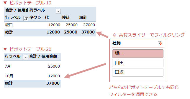 1つのスライサーを共有することにより、複数のピボットテーブルで同じフィルターを適用することができます。