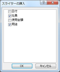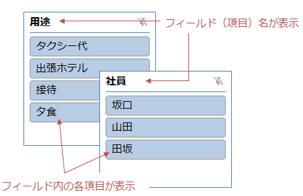 スライサーのフィールド(項目名)にチェックを入れる ※スライサーは「フィールド」ごとに作成されます。 ▼ スライサーが挿入されました