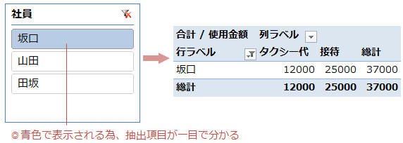 ▼ 複数のスライサーの項目ボタンをクリックすれば更に絞りこむことができます 「坂口」「タクシー代」をクリックすると、「坂口」の「タクシー代」が抽出されます ▼ 1つのスライサーで2つ以上の項目データを抽出したい場合は、CTRLキーを押しながらクリックします 「坂口」と「田坂」のデータが抽出されます。