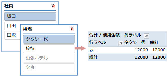 ▼ 複数のスライサーの項目ボタンをクリックすれば更に絞りこむことができます 「坂口」「タクシー代」をクリックすると、「坂口」の「タクシー代」が抽出されます