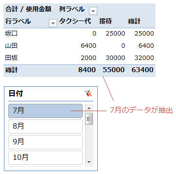 ▼ ピボットテーブルに配置されていないフィールドでも絞り込むことができます 例えば↓では日付フィールドは配置されていませんが、日付スライサーで「7月」のみのデータを抽出しています ★ピボットテーブルにはない「日付」フィールドでも抽出が可能