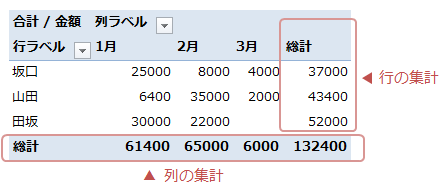 ピボットテーブルでは末尾に集計行・集計列が自動的に表示されます。