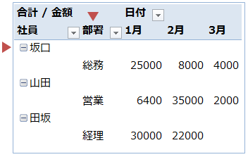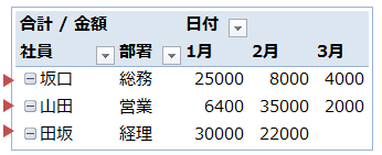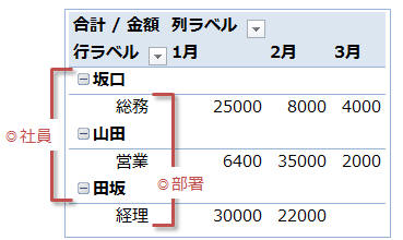 アウトラインを作成します。下図のように「行ラベル」に配置された項目は複数行/複数列で表示されます。