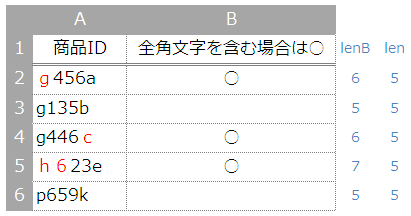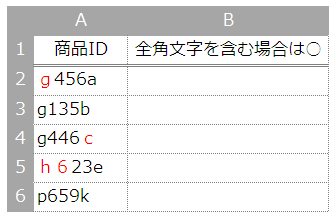 例えば「abc」「pen」「test95」といった全角文字(赤字部分)が含まれているセルをチェックすることができます。