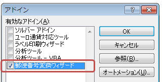 「郵便番号変換ウィザード」にチェックが入っていることを確認して「OK」をクリック
