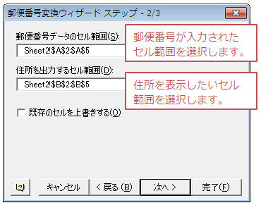 郵便番号のセル範囲と、住所を出力したいセル範囲を指定し「次へ」をクリック