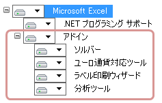「Microsoft Excel」−「アドイン」を展開し、任意のアドインを削除