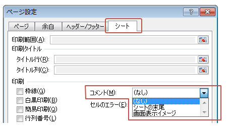 「シート」タブで「コメント▼」をクリックし「なし」「シートの末尾」「画面表示イメージ」から選択する