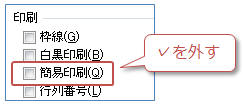 「ファイル」タブ−「印刷」をクリック 「ページ設定」をクリック 「シート」タブで「簡易印刷」のチェックを外す