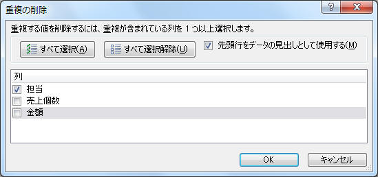 重要 ★1 複数列選択する と同一レコード(それらのセルの組み合わせが同じ行)が重複と認識されます。例えば… 「部署」「氏名」両方を重複の基準とした場合 総務 田中 営業 田中 総務 田中 営業 佐藤 → 総務 田中 営業 田中 営業 佐藤 ◎ 単数の列を基準とすると、重複する値が含まれている行 全体が削除されます。例えば… 「部署」を重複の基準とした場合 総務 田中 営業 田中 総務 田中 営業 佐藤 → 総務 田中 営業 田中