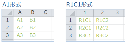 【A1形式】ではA列1行…のようにセル位置を表すため、A1、A2…と参照します。【R1C1形式】ではRow(行)Column(列)ともに数字で表示されます。1行1列…のようにセル位置を表すためR1C1、R2C1…と参照します。